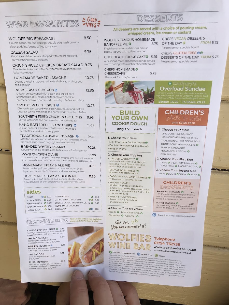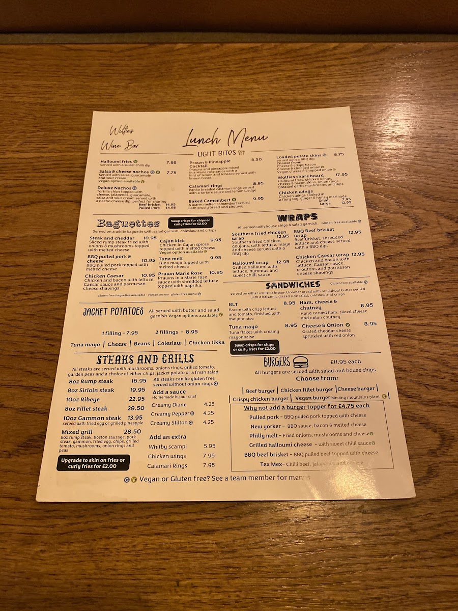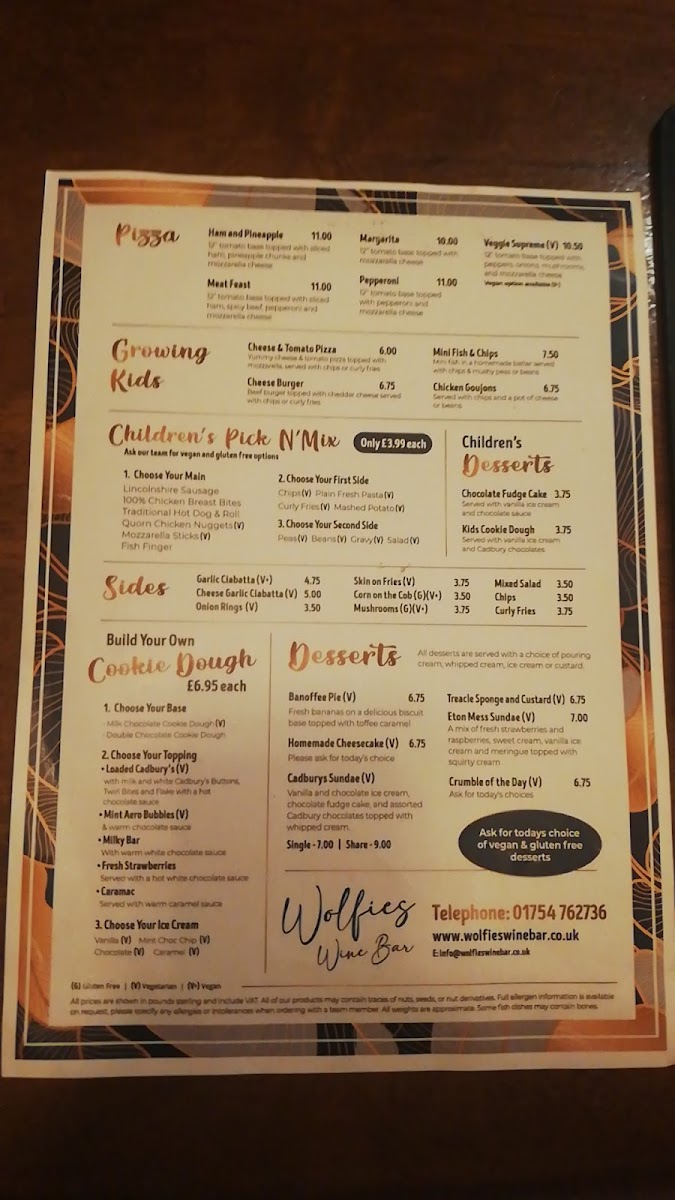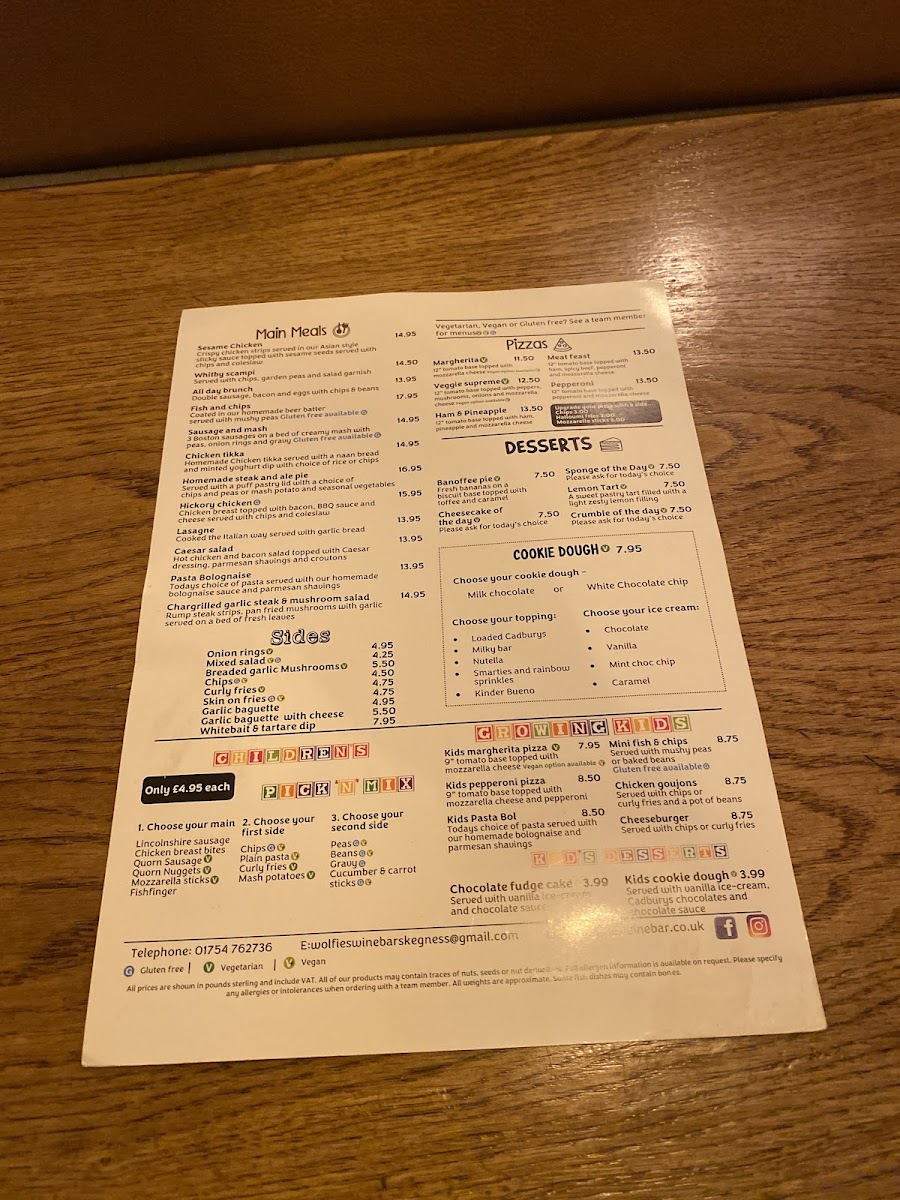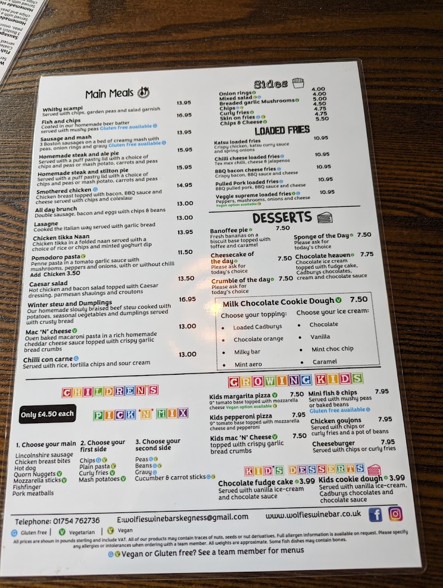 Welcome to Wolfies Wine Bar, a gem nestled in the bustling heart of Skegness. Located at 6 S Parade, this delightful establishment is renowned for its inviting atmosphere, friendly staff, and an impressive menu that caters to diverse palates. Guests rave about their culinary experiences, particularly the standout V burger and hearty steak & ale pie, which never fail to impress.
